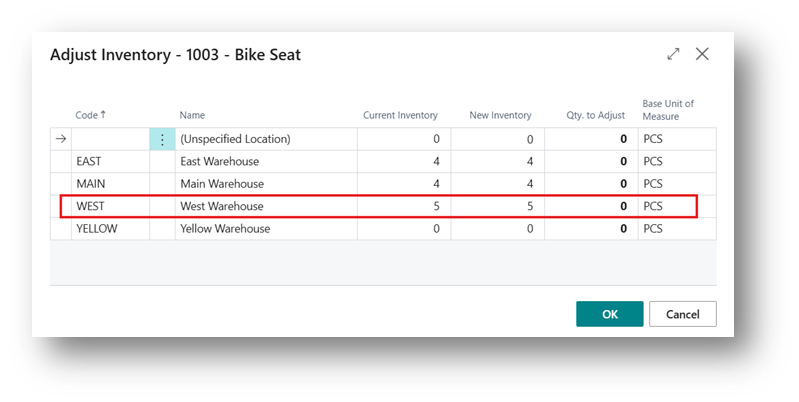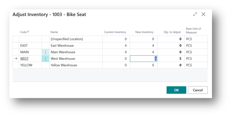 New window will open and in the “New Inventory Column” you can see that this is something which is Editable. In the example showed under there were 0 Quantity in the West Location and by clicking on Ok it will post an entry in the system.