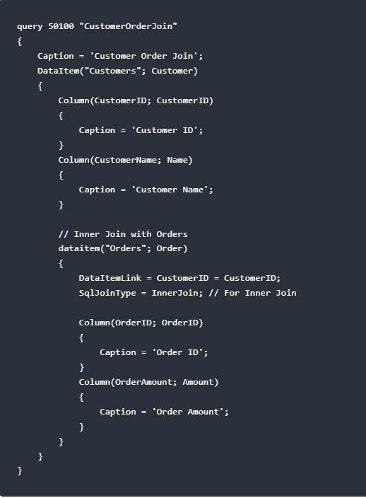In AL for Business Central, queries allow you to perform operations similar to SQL joins by using “DataItemLink” and “SqlJoinType” properties. Here’s how you can define these joins in a query object in AL, using the tables Customers and Orders as examples.