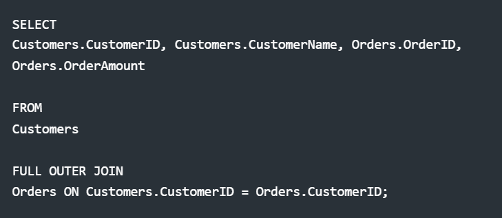 Explanation: All customers and orders are shown. Unmatched entries in either table have NULL values.