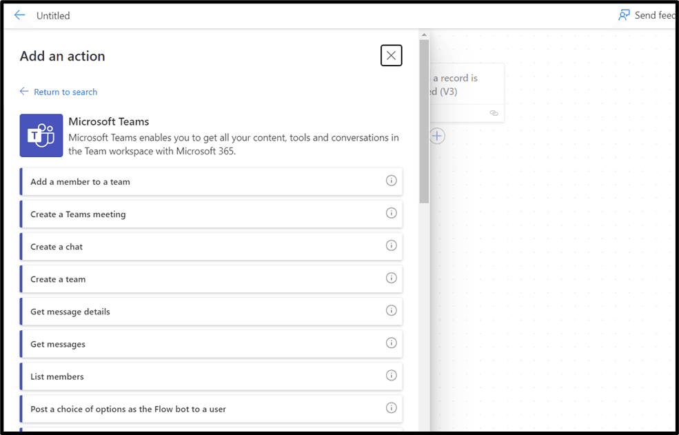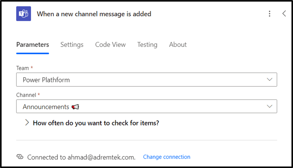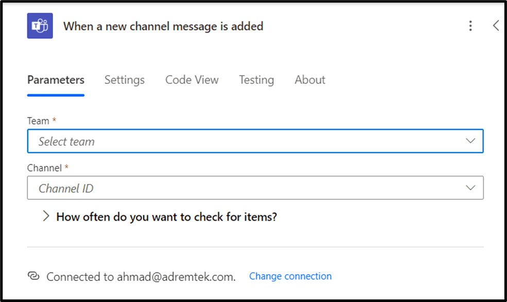 Now we are adding the Action of Teams and a Trigger name as “When a new channel message is added”.