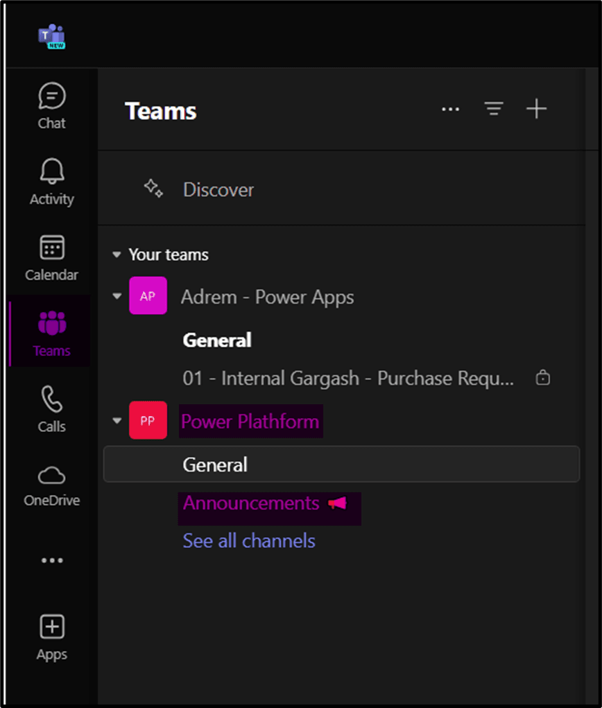Now before specifying the fields, let me show you the “Teams” and the “Channel” in the Microsoft Teams. We are going to create the notification in the “Power Platform and the Announcements”.