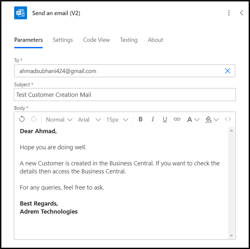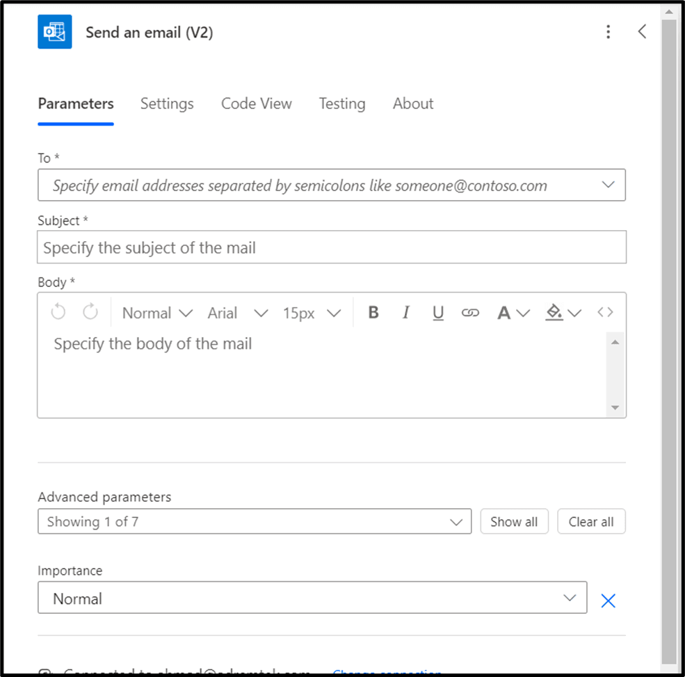 Click on the “Send an Email”. Now we have to specify the Parameters.