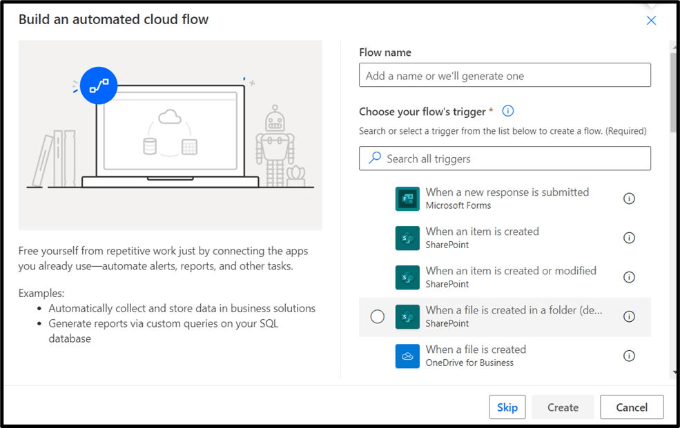 - Click on the Automated Cloud Flow and then a New window will open. After that specify a “Flow Name” and you can also specify the “Trigger”. If you specify a trigger then your process can be easily but for this example we are going to click on the “Skip”.