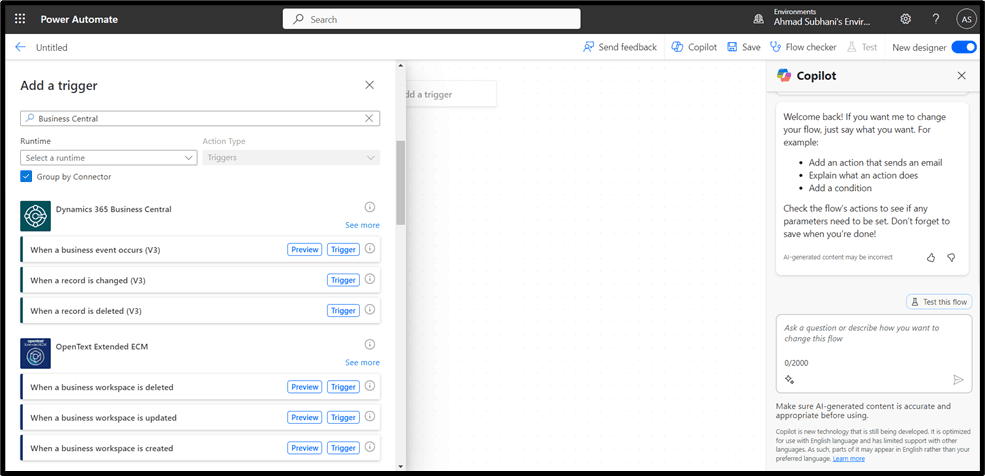 After that click on the “Add a trigger” and then Search the connector of “Business Central” and select that.