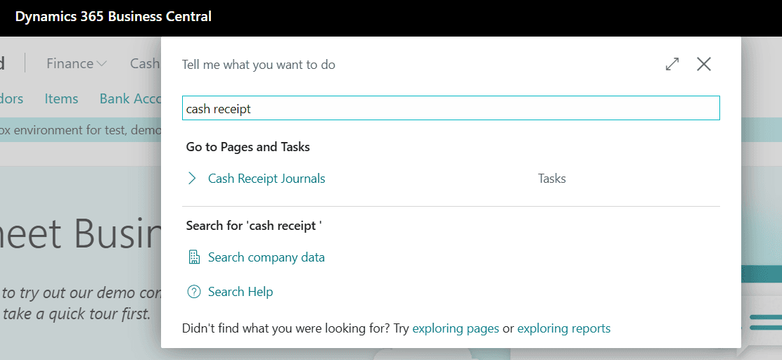 Click Search (Alt+Q) in the top-right corner, type Cash Receipt Journals, and open it.