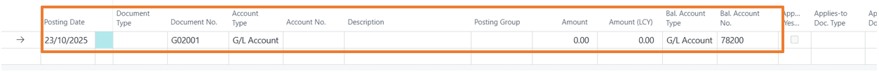 Set Bal. Account Type to G/L Account for cash, or Bank Account for bank payments.