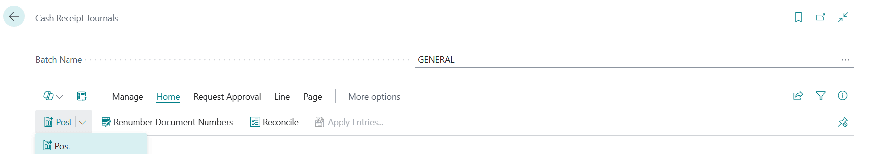 A cash receipt journal is a type of general journal in Business Central. You can use it to post payments to accounts like general ledger, bank, customers, vendors, and fixed assets. You can also apply the payment to customer entries at the time of posting or even later.
