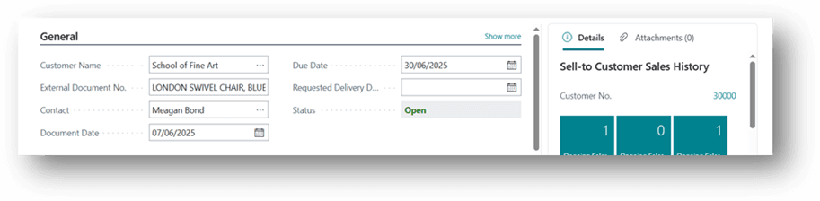 - Most of the remaining information (like currency, payment terms, salesperson, and address) will automatically populate from the Customer Master Data.