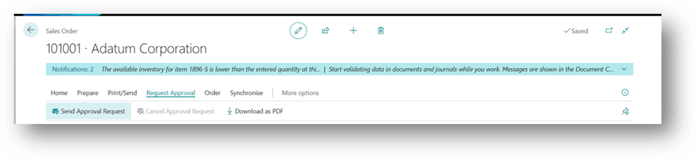 - Click on Send Approval Request to route the quote for approval.