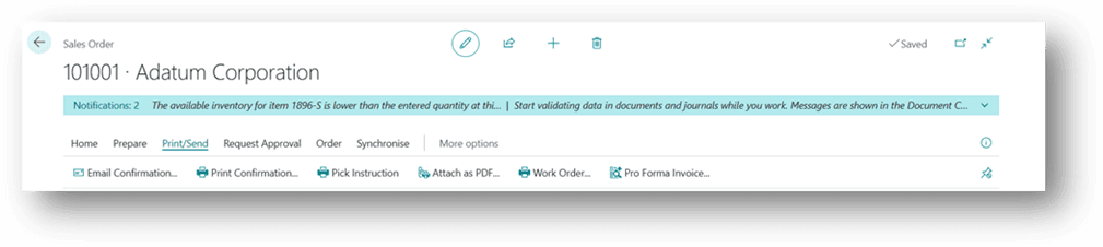 - On the Header, click Print/Send, and choose the required option to print the Sales Order or send it directly to the customer via email.