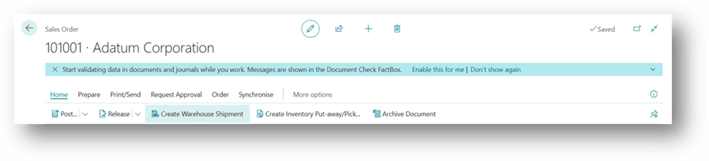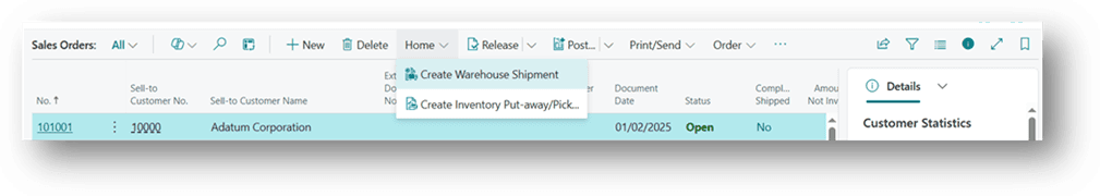 (Alternatively, open the Sales Order document and choose Create Warehouse Shipment from the header.)