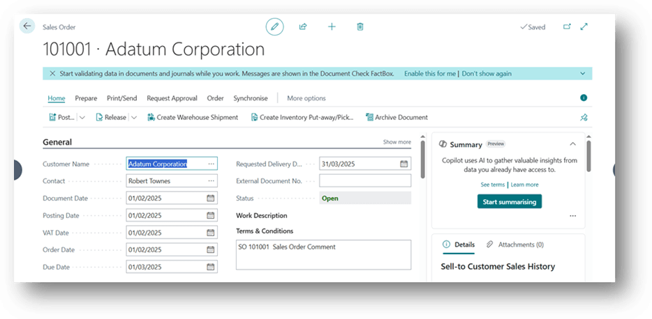 Every department plays a crucial role in the Sales to Receive (S2R) process, and their actions are tightly interlinked. A delay or inaccuracy at any stage such as an unposted shipment, incorrect invoice, or unrecorded payment can disrupt the entire workflow and impact on customer satisfaction or financial accuracy. Business Central strengthens process control by connecting every document and maintaining a complete audit trail throughout the sales cycle: