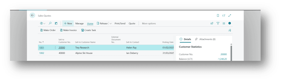 - On the Sales Quotes page, click New to create a new sales quote.