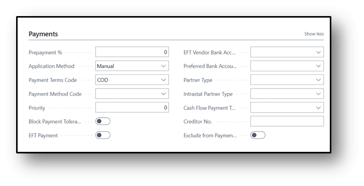 - Choose the Payment Method Code to define how payments will be made (e.g., bank transfer, cheque, cash).