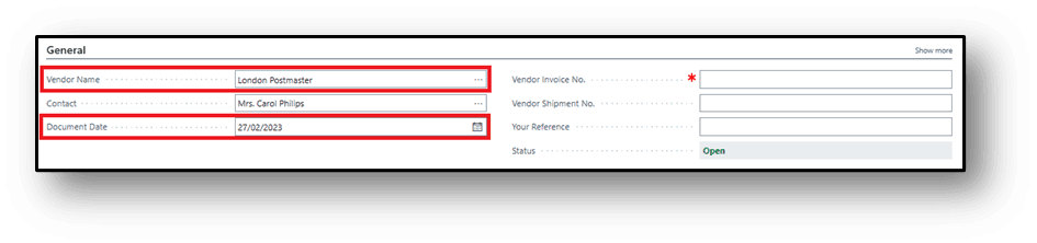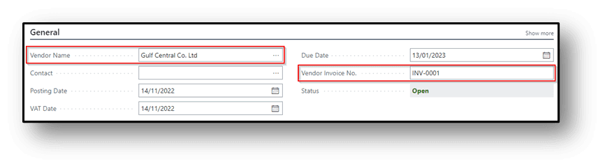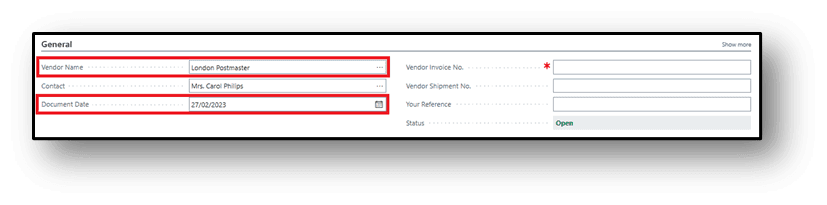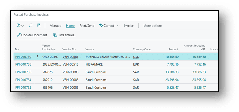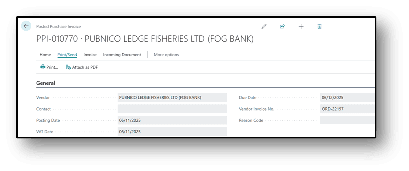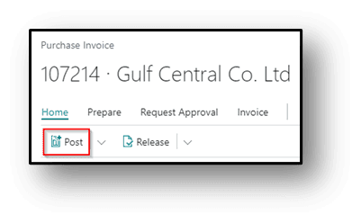 When the vendor sends an invoice, Finance posts it against the existing Purchase Order in Business Central. This creates a Posted Purchase Invoice linking the PO, Receipt, and Invoice in a three-way match for full accuracy.