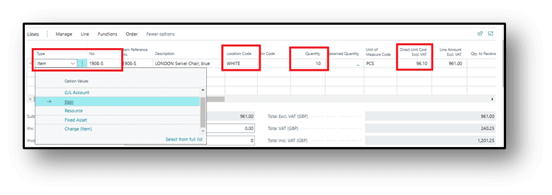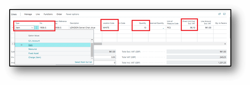 - Select the line type as an Item, GL Account, Fixed Asset or Charge (item).