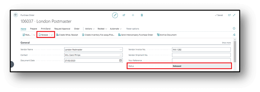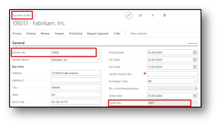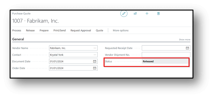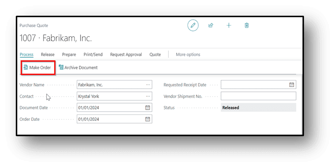 In Business Central, the process typically starts with a Purchase Quote. This document helps the team record supplier offers and negotiate pricing. Once the best supplier is chosen, the quote is converted into a Purchase Order (PO) — the formal confirmation of the purchase.