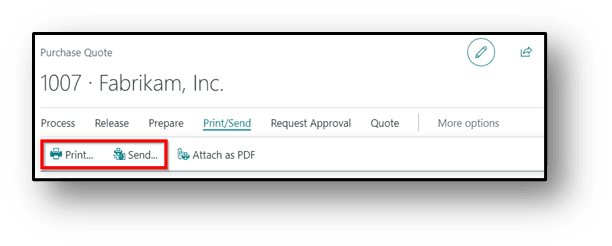 - On the Header click on Print/Send action from where choose the required option to print or send purchase quote directly to vendor via email.