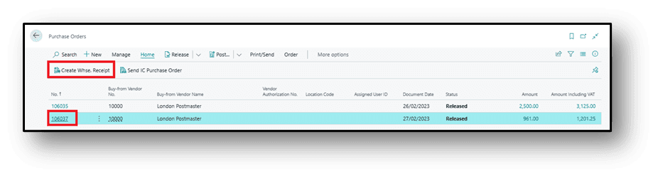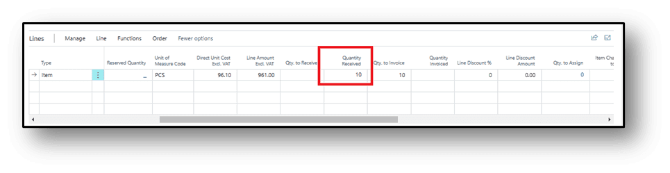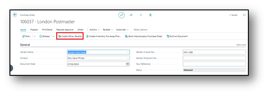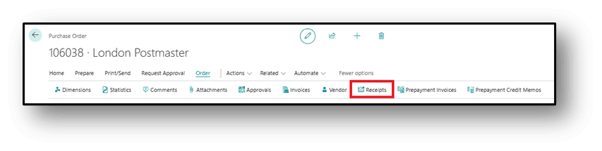 In Business Central, the warehouse team posts a Purchase Receipt once the items are physically received and inspected. This step ensures that the company’s inventory levels and item ledgers are automatically updated.
