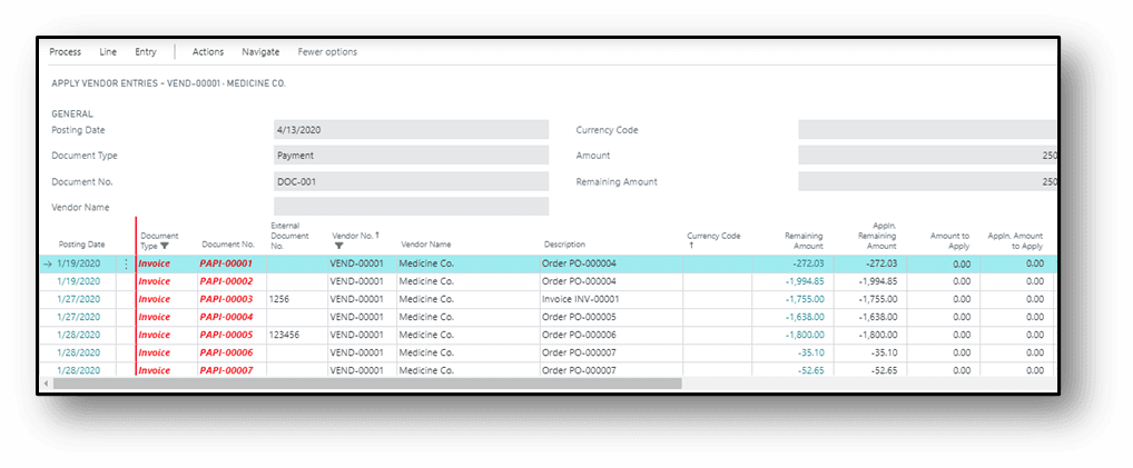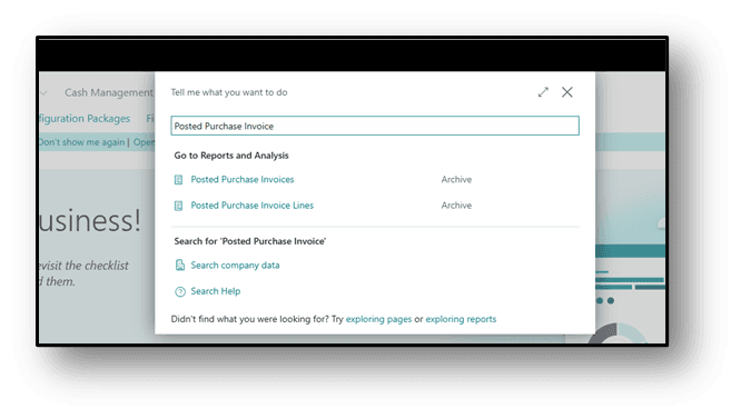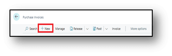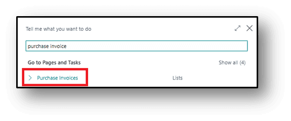 - Click the search button or Alt+Q on the application bar, enter Purchase Invoice, and then choose the related link.