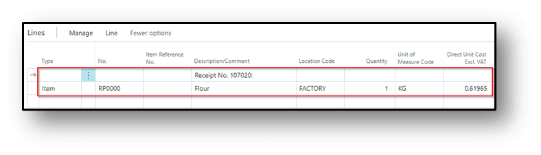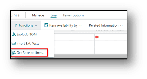 - Click on Line, Get Receipt Lines under Function action to select relevant Warehouse Receipt information and to enter it in the invoice lines.
