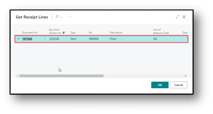- On Get Receipt Lines, select the receipt line according to the vendor you selected in the General Section.