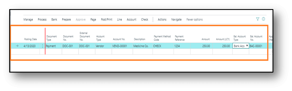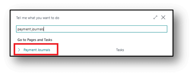 - Click the search button or Alt+Q on the application bar, enter Payment Journals, and then choose the related link.