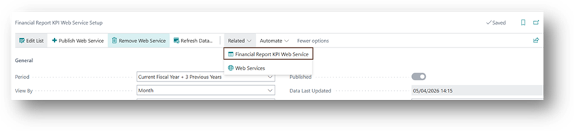 To check the data what is published then click on More option > Related > Financial Report KPI Web Service.