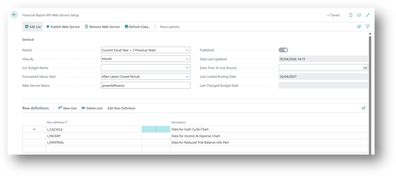This process is useful when you want to make financial reporting data available for analysis in external tools such as Power BI. By publishing the KPI web service, you create a data source that can be connected to and used for reporting, dashboards, and visual analysis.