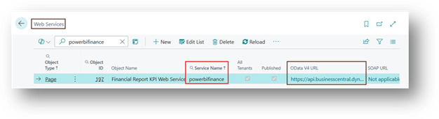 After publishing, the KPI web service appears on the Web Services page and can be used as a data source for Power BI. For example, we name the KPI web service “powerbifinance,” you need to publish it and then search this on the Web Services page.
