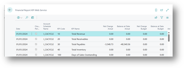 - To see the KPI data you have configured, select the Financial Report KPI Web Service action.